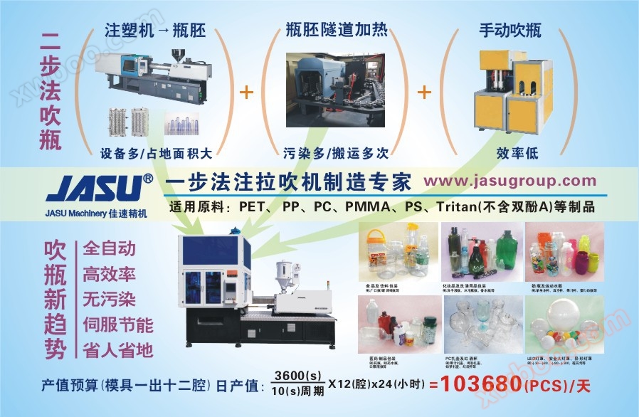 ■佳速ISB 800 AN-3ワンステップ注入ブローブロー成形機適用範囲が広く、使用可能な原材料の種類が非常に多く、その中にPC/PMMA/PP/PET/PS/Tritanシリーズ製品は:LEDランプカバー、PC電球、宇宙カップ、水筒、飲料瓶、容器内胆、PETシリーズには、化粧品ボトル、薬瓶、広口ボトル、食品包装、飲料ボトル、PPシリーズには、哺乳瓶、水瓶、水筒、食品包装などが含まれている。佳速ISB 800 AN-3ワンステップ注入ブローボトル機で生産された製品は、バリがなく、無水口材料がなく、欠陥が少なく、完璧な口部、底部、スリット線を持ち、より透明でより高い剛性を持っている。